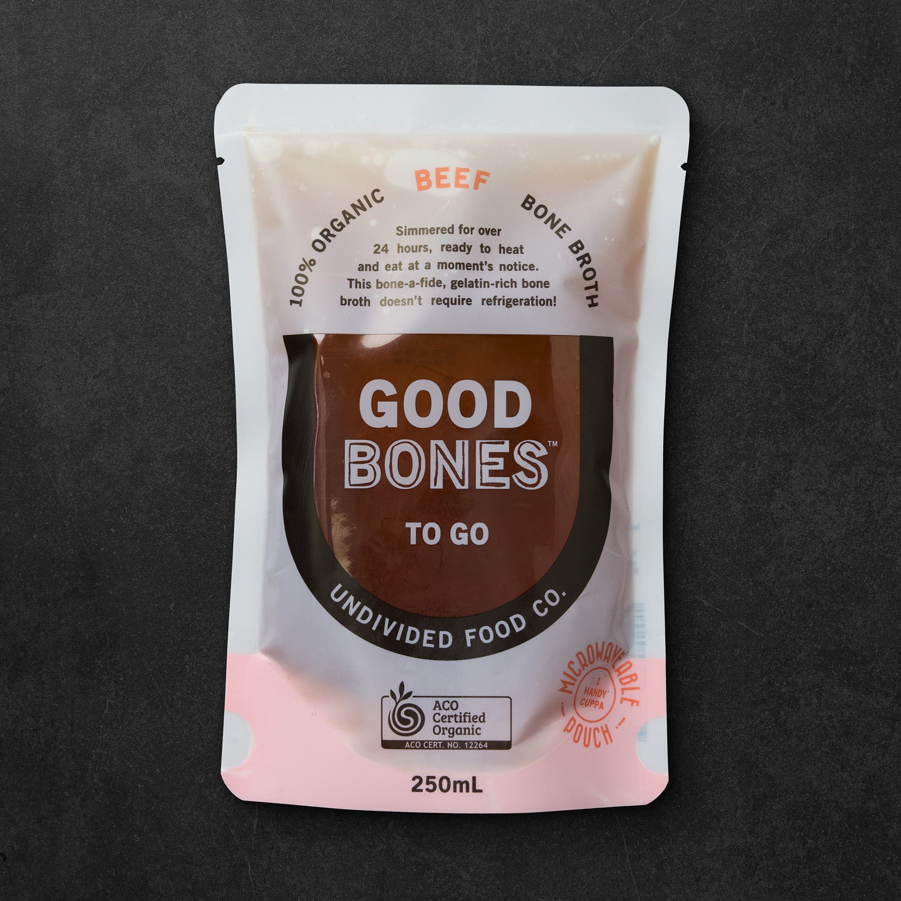 A 100% organic, gelatin-rich beef bone broth simmered for over 24 hours. Ready to heat and sip on the go, with no refrigeration needed. Certified organic and packaged in a microwaveable pouch.